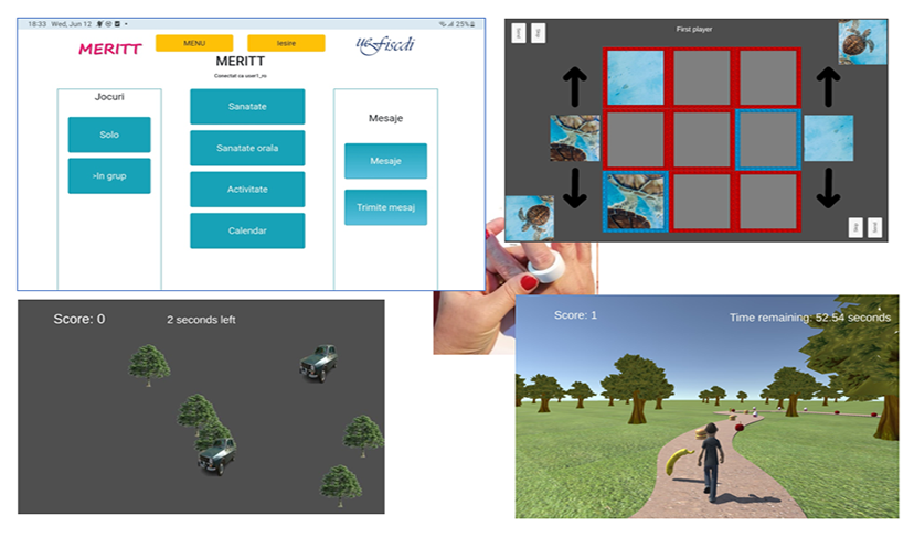 Activitatea 3.1: Implementarea principalelor functionalitati ale platformei MERITT: Prezinta: (i) implementarea bazei de date, cu tabelele aferente pentru salvarea datelor achizitionate, (ii) extinderea jocului match game, astfel incat trecerea la urmatorul nivel sa fie realizata in functie de performantele curente ale utilizatorului (fara ca acesta sa poata alege un divel cu o dificultate mai mare daca performantele sale curente sunt slabe); (iii) implementarea unei aplicatii creata in Unity 3D pentru pentru utilizarea periutei inteligente (detinuta de CITST) care permite vizualizarea in timp real a progresului duratei periajului, durata raportata la 2 minute cat este durata recomandata de medicii stomatology; pentru achizitionarea parametrilor de la periuta si a-i utiliza in motorul Unity a fost folosita biblioteca Bluetooth LE for iOS, tvOS and Android; (iv) implementarea unui joc multi-player, implementat in Unity 3D, presupune interactiunea intre 2 utilizatori avand drept scop rezolvarea unui puzzle; Fiecare jucator are acces la un numar de piese, cu care va putea rezolva numai o anumita zona a puzzle-ului. Numarul de piese si celule pentru fiecare utilizator este dat de cantitatea parametrilor de sanatate si bunastare masurati de platforma MERITT – masurarea regulata a parametrilor si efectuarea unui numar optim de pasi/zi duce la obtinerea unui numar mai mare de piese si celule de puzzle; (v) implementarea interactiunii prin intermediul inelelor smart si examinarea empirica a perceptiilor si preferintelor persoanelor in varsta pentru tehnologia dispozitivelor purtabile a inelelor inteligente, pentru folosind metoda interviului semi-structurat cu noua participanti.