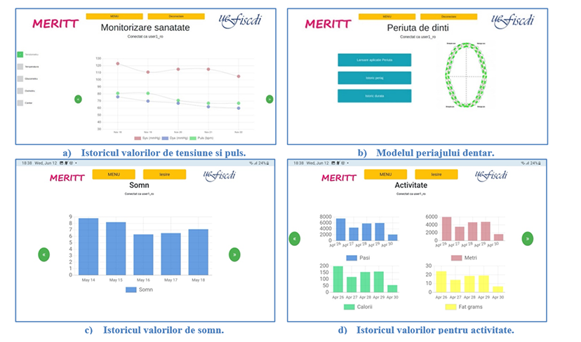 Platforma MERITT testata este realizata ca o aplicatie web in care functionalitatile acesteia sunt accesate prin intermediul unor pagini web. In cazul functionalitatilor pentru jocuri, colectarea parametrilor de sanatate sau sanatate orala sunt lansate aplicatii Android care realizeaza aceste functionalitati. Pentru a se putea conecta la platforma MERITT, utilizatorul trebuie sa se autentifice in pagina principala, fie prin introducerea numelui de utilizator si parola, fie cu ajutorul unui tag RFID. Interactiunea cu interfata poate fi facuta atat prin touch cat si prin gesturi folosind inele inteligente. Testarea acestora din urma a relevat ca utilizarea lor poate aduce beneficii semnificative prin promovarea unei experiente de utilizator intuitive, adaptate nevoilor si preferintelor utilizatorilor varstnici.